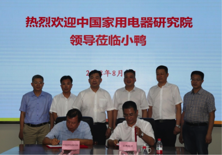 通過會談雙方在共性技術研究與交流、研發成果評價與檢測、《家電科技》理事會成員等方面的合作取得共識,并達成戰略合作協議,魯建國所長與邢照斌總經理在劉挺院長、李永剛董事長見證下,簽署了中國家用電器研究院和山東小鴨集團戰略合作協議。